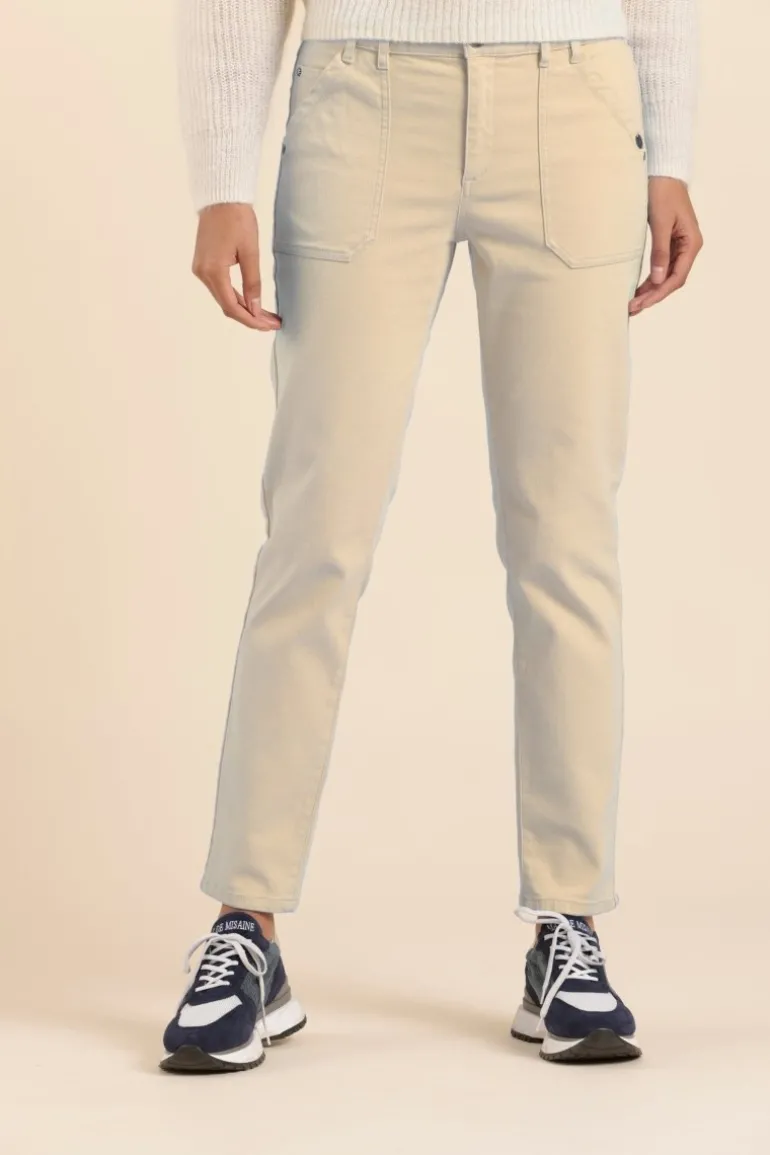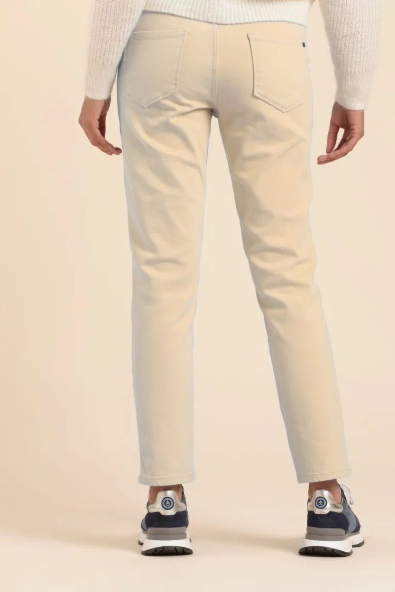 – Coton, coton recylé & elasthanne- Denim couleur- Taille haute – Jambe droite- Double passant ceinture- 2 poches a…