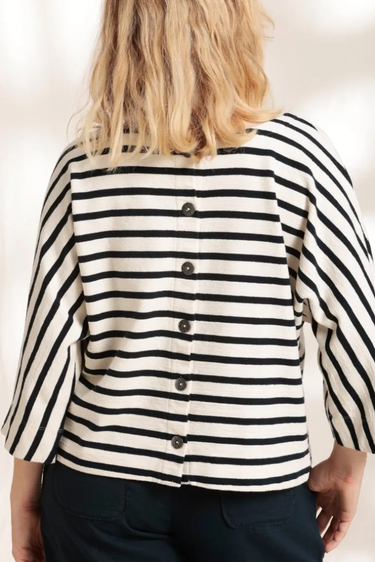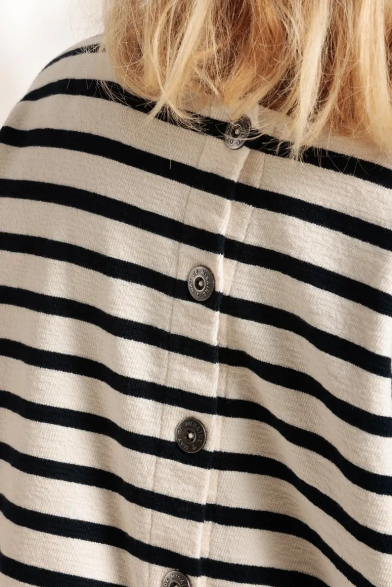 – Jersey de coton biologique rayé- Manches longues- Col rond- Boutonnage sur toute la longueur du dos