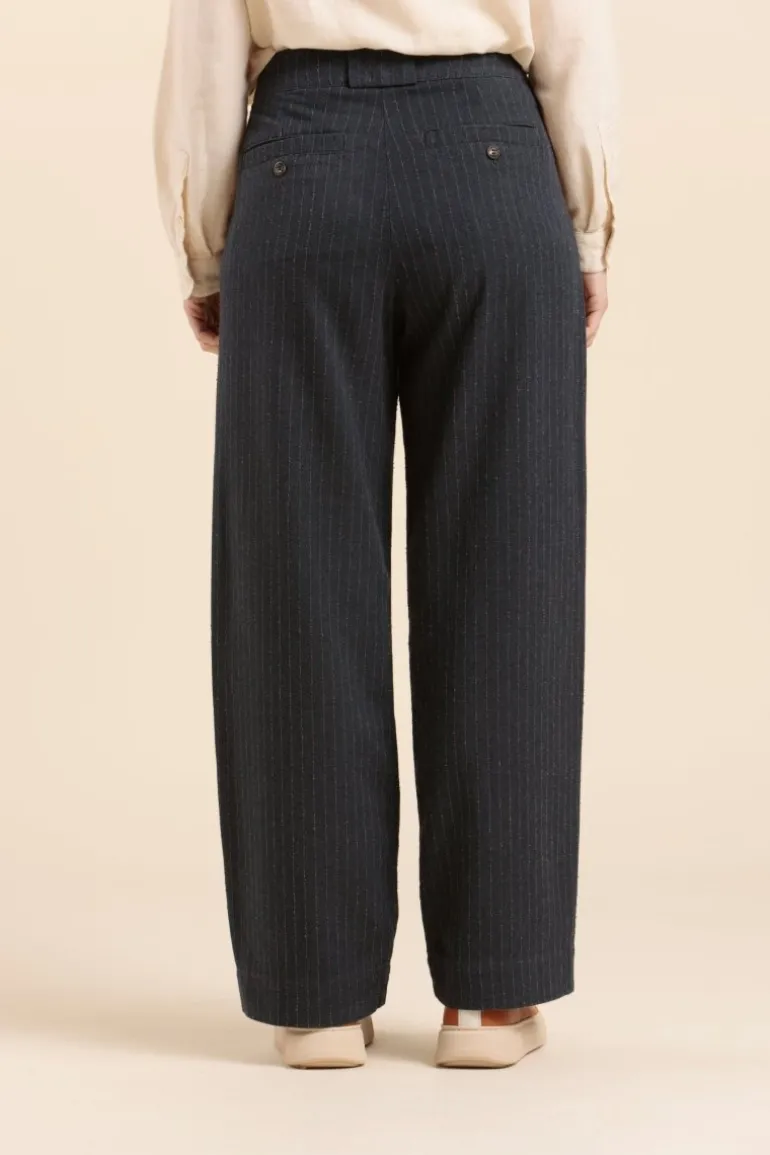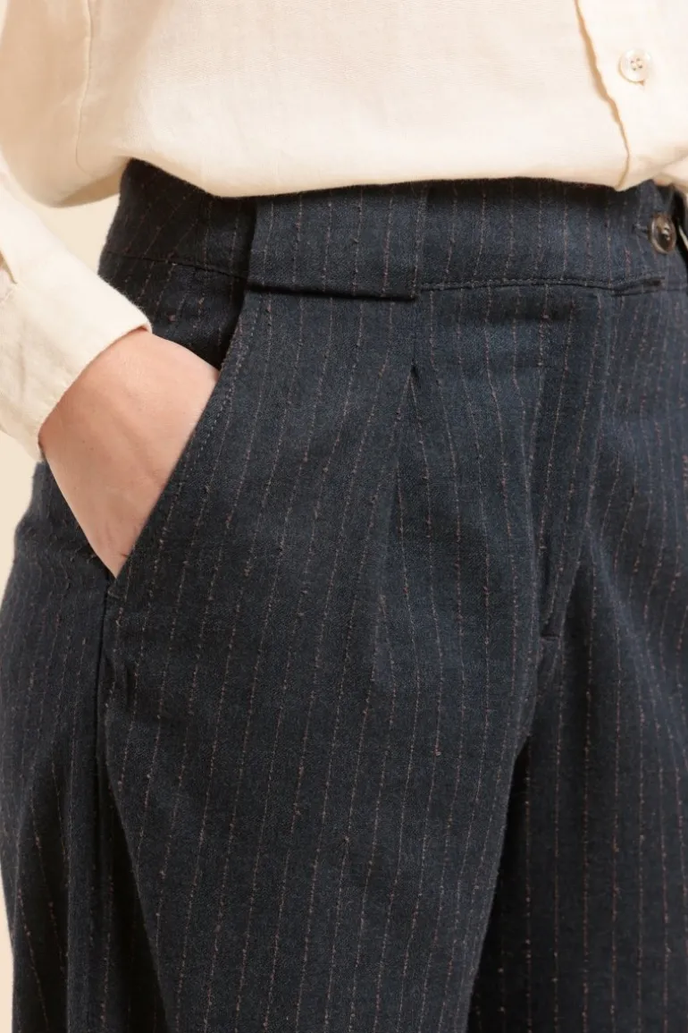 – Coton, viscose & polyamide- Pantalon flanelle de coton- Fines rayures- Taille haute – Jambe large- 2 poches a l…