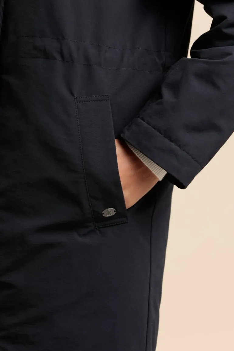 – Coton & polyamide – Parka longue- Capuche attenante avec cordon de serrage- Fermeture boutonnée – Matière déper…