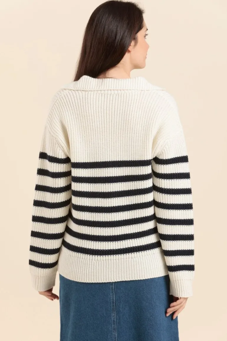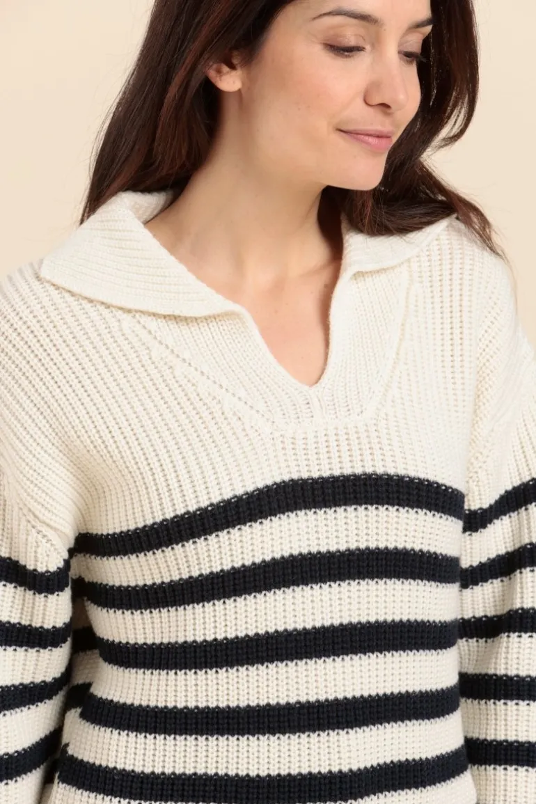 – Laine vierge & polyacrylique – Pull rayures- Grosse maille – Col esprit vareuse