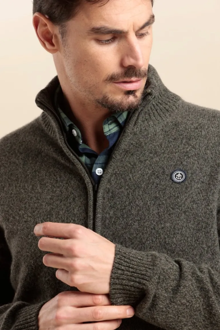 – Laine&polyamide – Cardigan zippé – Fil mouliné – Badge brodé