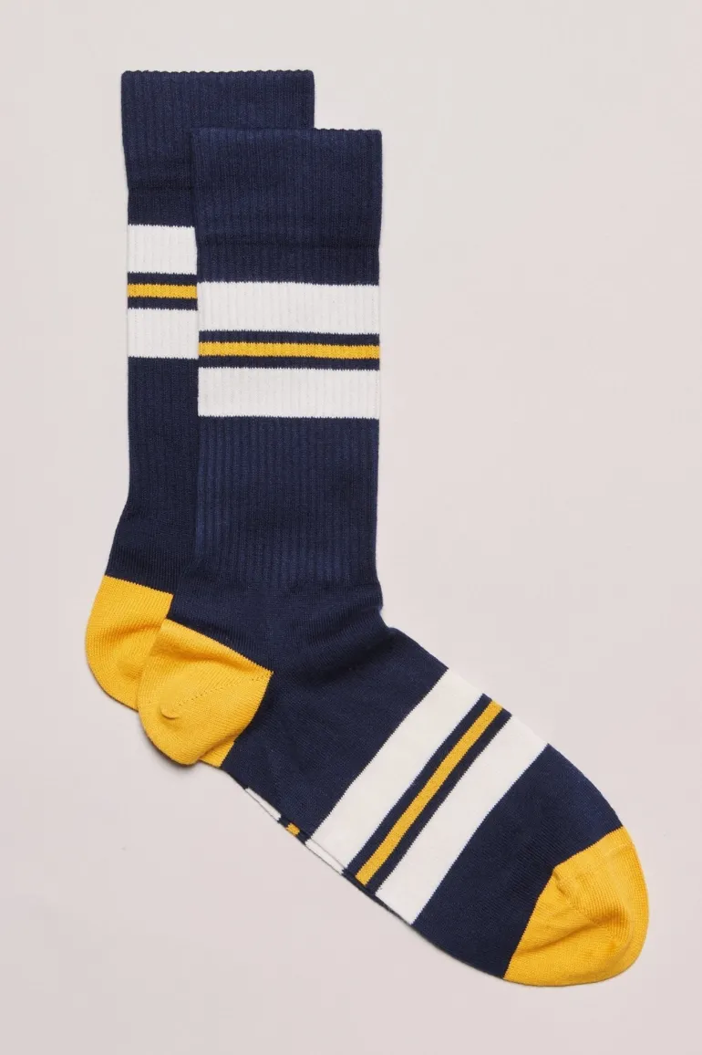 – Fil egyptien- Longueur mi-haute- Côtes et bord côte avec finition élastique- Jeu de rayures- Pointe et talon contra…