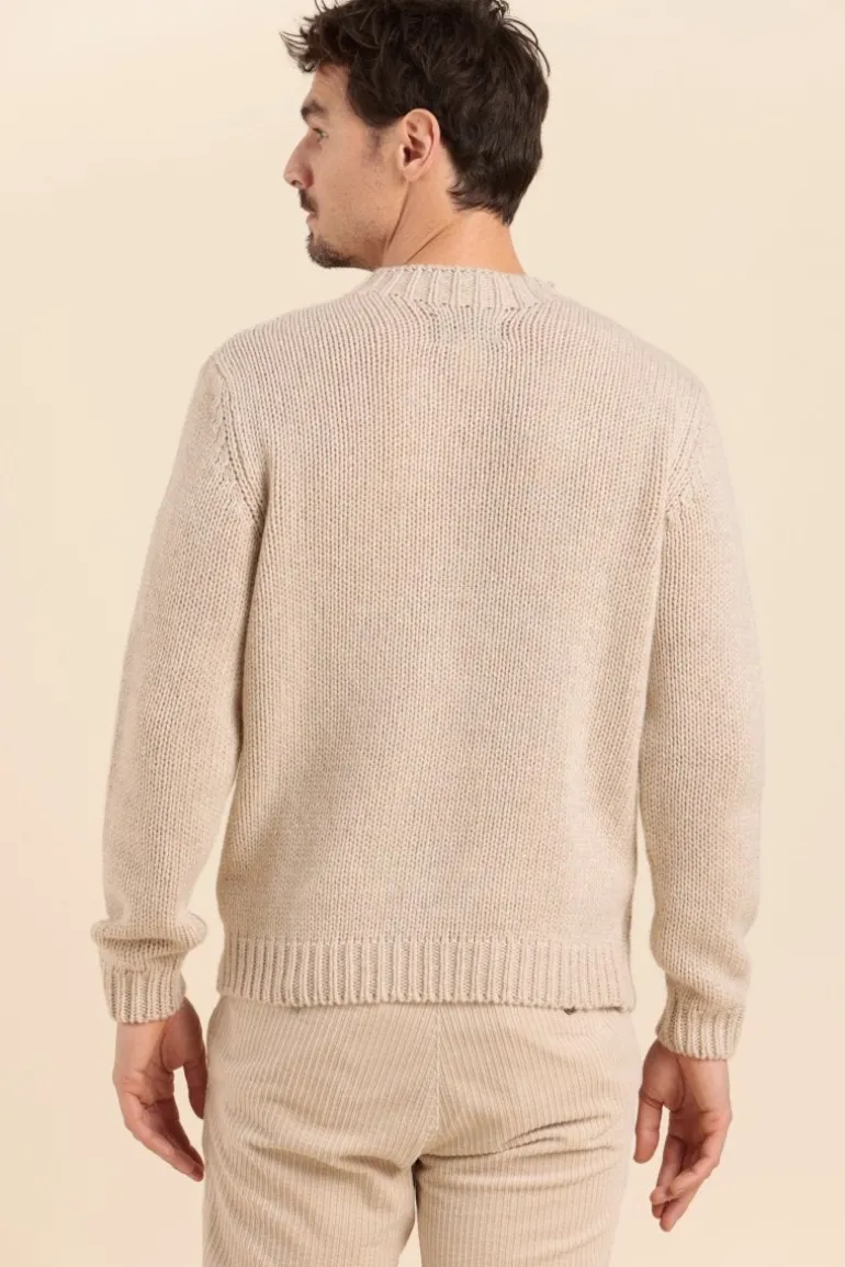 – Laine recyclée, polyamide et autres fibres – Pull col rond- Torsades- Badge brodé